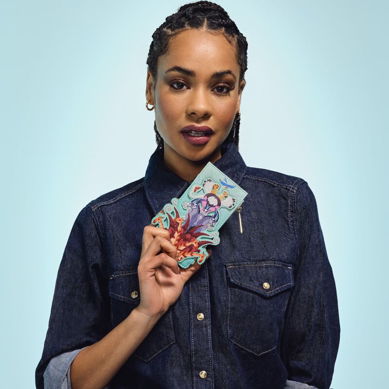 Wallet zips and snaps closed. Other features include three slots for holding cards, a clear window slot for holding your ID, shiny silver hardware, vegan leather (polyurethane) and printed details. Note the coordinating lining.