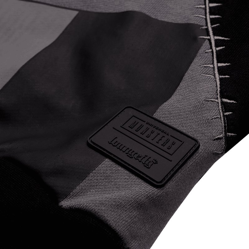 What a beautiful fright! This Bride of Frankenstein hoodie features a stunning rendition of Frankenstein’s bride and Frankenstein in stained-glass portrait style. Together, they share a moment in the spotlight as a diagonal “split screen.” A line of embroidery “stitches” the two portraits together on the diagonal. On the back, the Bride of Frankenstein’s lightning bolt stripes appear near the top as a layered element. Tour your favorite haunts or revive your spirits at the movie theater in style with this comfy hoodie.